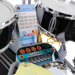Perkussionseffekte und Lichteffekte werden bei Schlagn mit den Sticks auf Trommeln und Becken aktiviert. Die Trommeln können mit dem Telefon verbunden werden, um pulsierende Lichtrhythmen zu erzeugen, die dem Kind beim Erlernen des Schlagzeugspiel helfen. Das Bedienfeld ermöglicht es, das Telefon oder Kopfhörer anzuschließen und Musikunterstützungen hinzuzufügen.