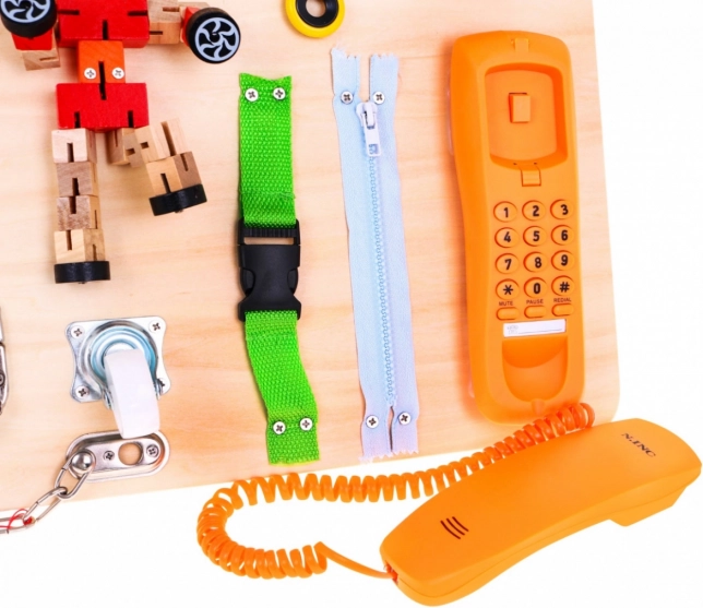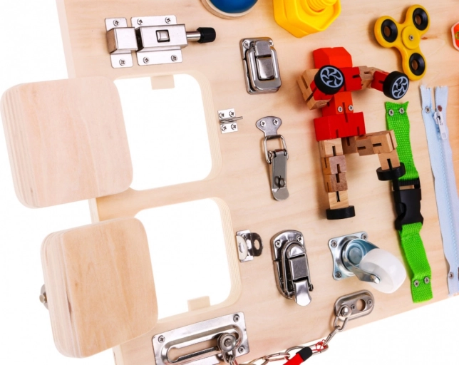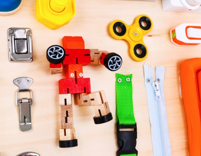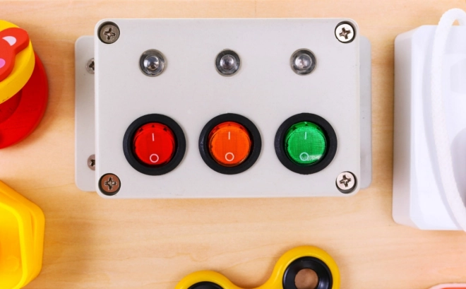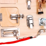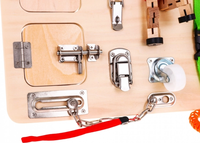 Die Tafel enthält eine Vielzahl interaktiver Elemente wie Schlösser, Schalter und Rückstellmechanismen, die die Verbesserung der Feinmotorik und das Lernen von kausalen Beziehungen unterstützen.
