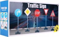 Im Set enthalten sind HALT (STOP), Gebot rechts abzubiegen, Vorfahrt gewähren, Vorfahrtstraße und Fußgängerüberweg – ideal zur Gestaltung eines Verkehrsübungsplatzes.