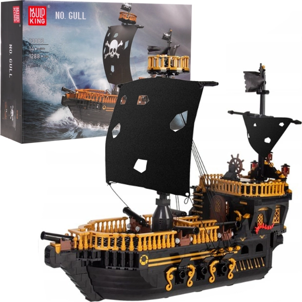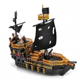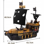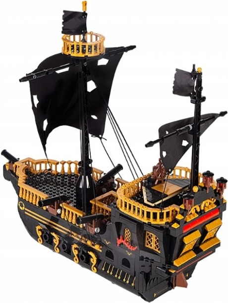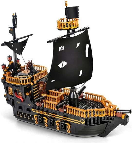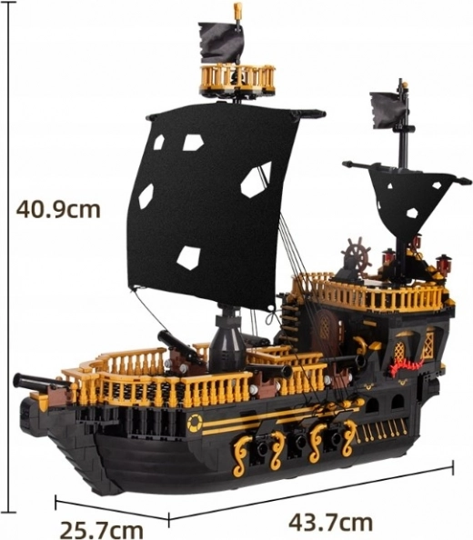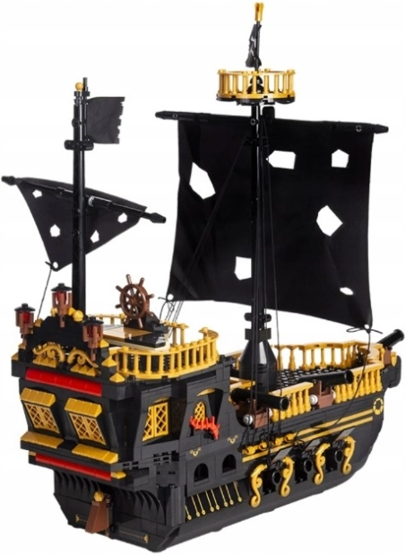Das Schiff ist mit detaillierten Elementen gefertigt, die an ein echtes Piratenschiff erinnern, einschließlich schwarzer Segel und goldener Verzierungen.