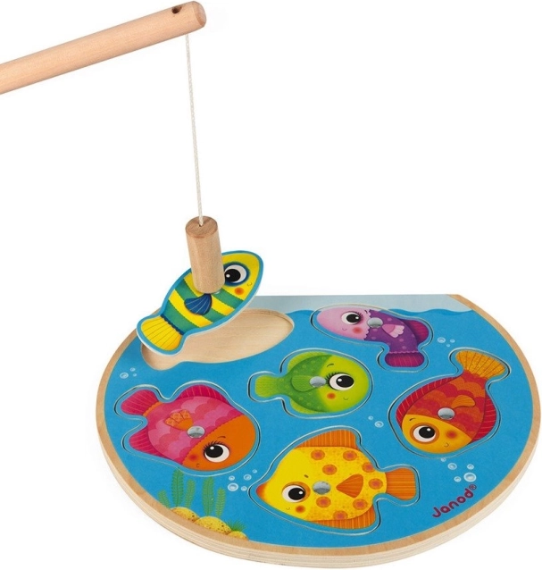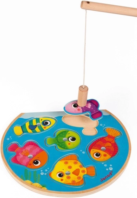 Entdecken Sie das erste magnetische Spiel für die Kleinsten: ein Holz-Steckpuzzle mit Angelmotiv der Marke JANOD. Dank der magnetischen Angelrute „fangen“ Kinder die bunten Fische ganz leicht und lernen, sie an die richtige Stelle zurückzulegen. Das Spiel fördert auf spielerische Weise Geduld, Genauigkeit und Konzentration.
