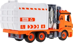 Mit dem Schraubendreher mit Wechselbits kann das Kind das Auto auseinander- und wieder zusammenbauen. Der Seitenarm hebt und entleert die Container wie bei einem echten Müllfahrzeug.