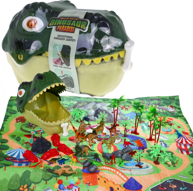 Der große Dinosaurierkopf dient als robustes Aufbewahrungssystem mit leicht zu öffnendem Verschluss und Griff. Nach dem Spielen ist alles schnell verstaut und kann bequem mitgenommen werden.