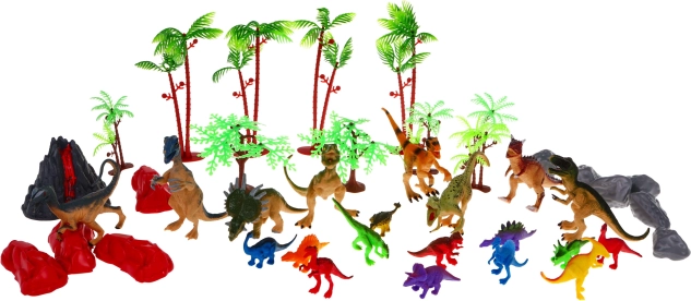 Unterschiedlich große Dinosaurierfiguren, Bäume, Felsen, Steine und ein Vulkan ermöglichen das Bauen authentischer prähistorischer Szenen und Geschichten.