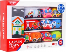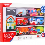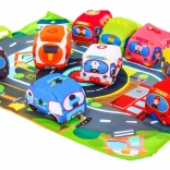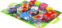 Dieses vielseitige Set fördert die Kreativität und das fantasievolle Spiel von Kindern ab 12 Monaten. Neun farbenfrohe Fahrzeuge – zum Beispiel Schulbus, Feuerwehrauto, Krankenwagen, Taxi, Polizeiwagen, Betonmischer, Lkw, Eiswagen und Donut-Truck – laden dazu ein, die auf der weichen Matte aufgedruckte Stadt zu entdecken.