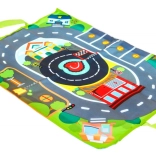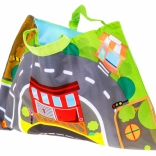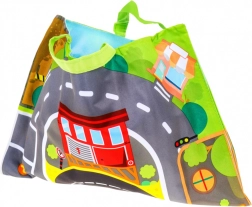 Die Matte mit Straßen, Häusern und Natur lässt sich dank Klettverschlüssen zu einer praktischen Tragetasche mit Griffen zusammenfalten. Einfach zu verstauen und überallhin mitzunehmen.