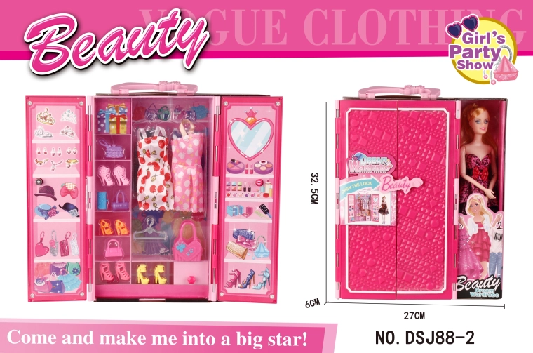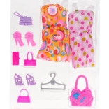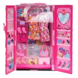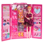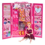 Enthalten sind eine Puppe im Gesellschaftskleid und umfangreiches Zubehör: 2 Kleider, 5 Handtaschen, 4 Paar Schuhe, 3 Kleiderbügel und eine Box für Kleinteile. Der Kleiderschrank lässt sich weit öffnen für bessere Übersicht und stilvolle Präsentation der Kleidung.