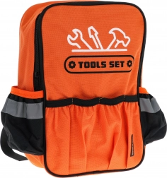 Der Rucksack besteht aus robustem Textil, verfügt über ein Hauptfach mit Reißverschluss, Seiten- und Fronttaschen sowie verstellbare Träger für bequemes Tragen. Im Set fehlen weder Säge, Hammer, Schraubendreher mit Bits, Schlüssel, Schrauben mit Muttern noch Montageplatten – alles in kindgerechter, leichter und langlebiger Ausführung.