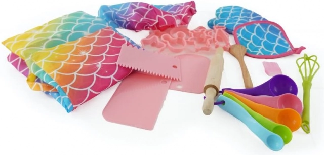 Alles Nötige in einem Set: Schürze, Kochmütze, Ofenhandschuh, Ausstechformen, Messbecher, Teigroller, Kochlöffel und Schneebesen. Kinder haben alles griffbereit und können sich ganz auf die Freude am Backen konzentrieren.
