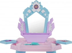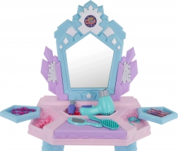 Der Schminktisch in Pastellfarben wird zum hübschen Blickfang im Kinderzimmer und fördert Rollenspiel, Kreativität und feinmotorische Fähigkeiten. Durch Drücken der Taste am unteren Teil des Spiegels leuchten Lichter auf und Prinzessinnen erscheinen, begleitet von Melodien. Der Kinderföhn erzeugt Geräusche und einen leichten Luftstrom – so wird das Friseurspiel noch realistischer.