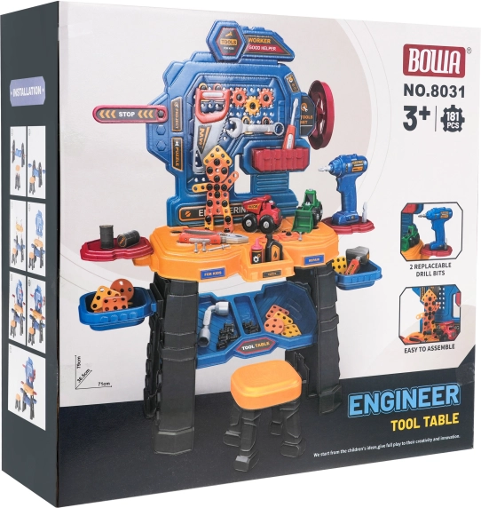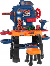 Dieses farbenfrohe Werkstattset verwandelt das Kinderzimmer in eine echte Mini-Werkstatt. Die robuste Werkbank mit Ablagen und Organizer wird durch einen bequemen Hocker und eine batteriebetriebene Akku-Bohrmaschine (2× AA, nicht enthalten) ergänzt. Kinder können schrauben, bohren und eigene Projekte bauen, einschließlich zwei Baufahrzeugen – Radlader und Kipper.