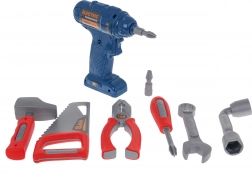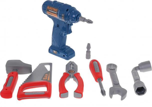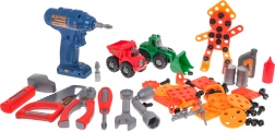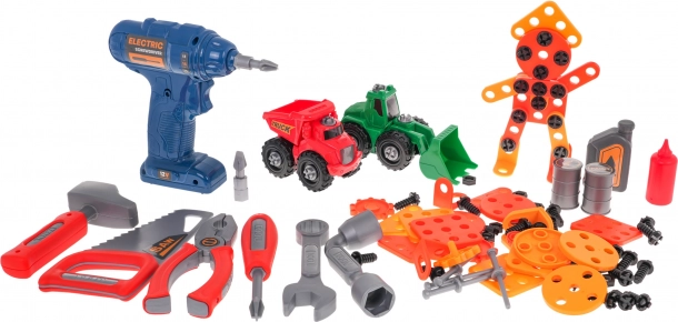 Enthalten ist ein umfangreiches Set an Werkzeugen: Bohrmaschine mit Bits, Säge, Hammer, Schraubendreher, Schlüssel, Zange, Dutzende Schrauben, Dübel und Unterlegscheiben sowie Zahnräder für erste Begegnungen mit Mechanik. Dank der vielen Teile und Formplatten trainieren Kinder Geduld, Logik und Koordination.