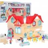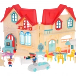 Zum Lieferumfang gehört ein umfangreiches Zubehörset: Möbel für Wohnzimmer, Schlafzimmer und Küche, Dekorationen, ein Auto mit beweglichen Rädern und drei Figuren (Mama, Papa, Kind). Dank des einfachen Aufklappens und der öffnenden Türen ist das Spielen übersichtlich und bequem.