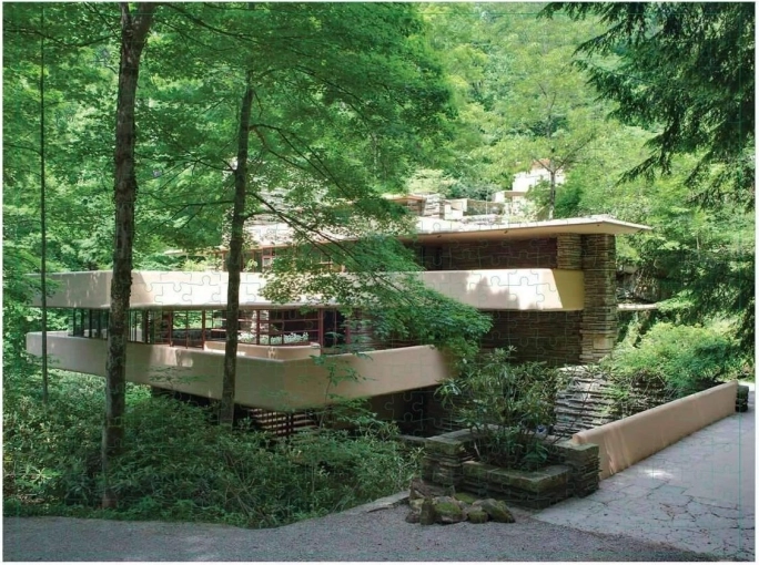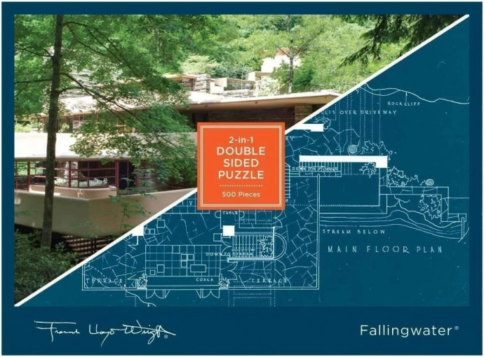Das Puzzle zeigt auf der einen Seite das Motiv eines der berühmtesten Häuser – das Haus mit dem Wasserfall, Fallingwater – und auf der anderen Seite den Bauplan dieses Gebäudes. Die Puzzleteile haben zwei Oberflächenfinishs – glänzend und matt. Dadurch lassen sich die einzelnen Motive leichter voneinander unterscheiden. Größe des zusammengesetzten Puzzles ca. 61 × 46 cm