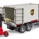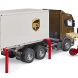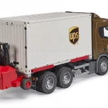 Das Modell der Reihe SCANIA R von BRUDER überzeugt durch die Kombination aus Komfort und Robustheit. Die Fahrerkabine mit dynamischem Design verfügt über öffnende Türen, klappbare Außenspiegel und ist vorbereitet für ein Licht- und Soundmodul. Der Containeraufbau ist vollständig wechselbar – dank Stützbeinen lässt er sich leicht abkoppeln und anheben, damit die Zugmaschine herausfahren kann.