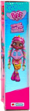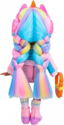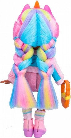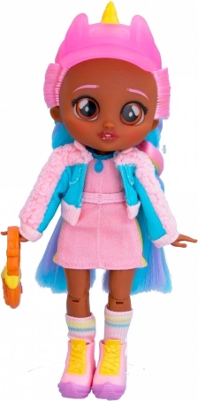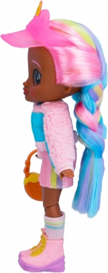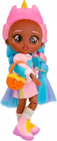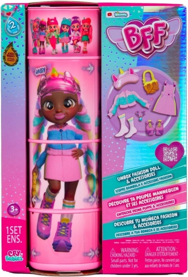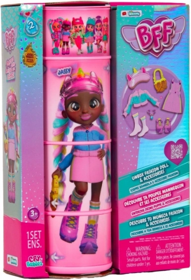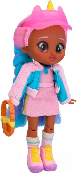Jassy, mit stylischen, regenbogenfarbenen Haaren, Glasaugen und 6 beweglichen Teilen, ist bereit für jedes Abenteuer! Sie trägt ein modisches Outfit, das durch einen niedlichen Hut mit Einhornhorn ergänzt wird! Sie hat eine sportliche rosa-blau Jacke, einen bezaubernden rosa Rock und passende Sneaker an! Vergiss nicht, auch die Brezel-förmige Handtasche und die BFF-Halskette hinzuzufügen!