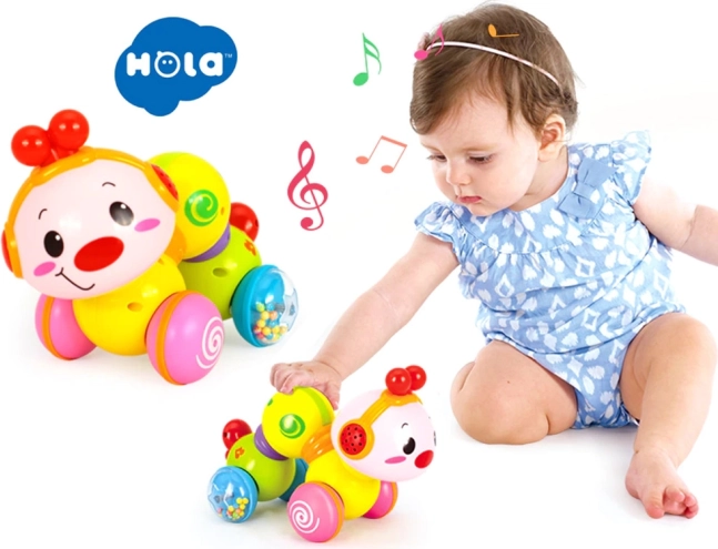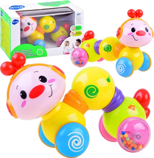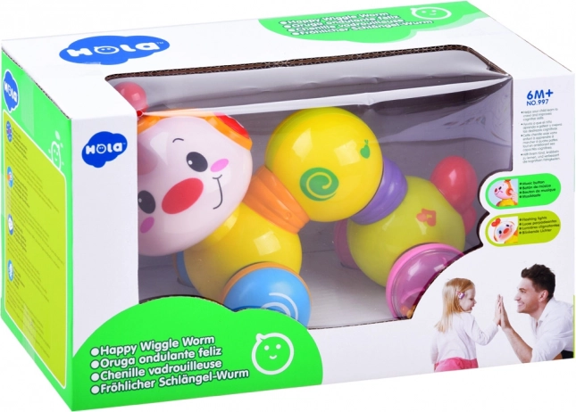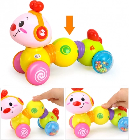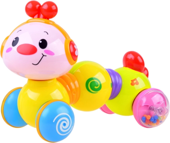 Die interaktive rollende Raupe Happy Wiggle Worm ist das ideale Spielzeug für Babys und Kleinkinder. Nach einem Druck auf den Rücken setzt sich die Raupe auf ebenen Flächen in Bewegung, während der Kopf die Farben wechselt und angenehme Melodien erklingen. Der drehbare Kopf fördert Neugier und die Feinmotorik.