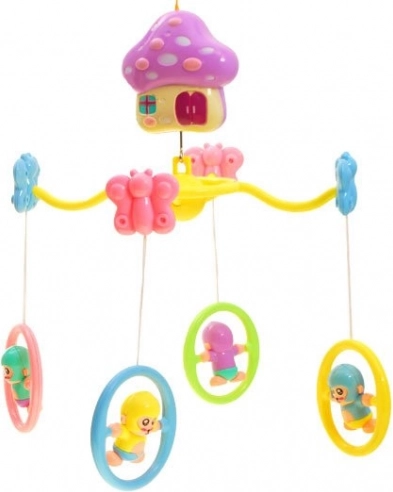 Die Konstruktion des Karussells ist aus Kunststoff und das Spielzeug dreht sich automatisch. Die Spieluhr ist in Form eines pastellfarbenen Häuschens und bietet die Möglichkeit, die Lautstärke der gespielten Melodie anzupassen.