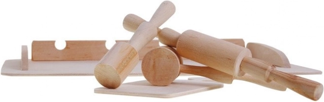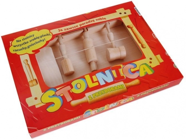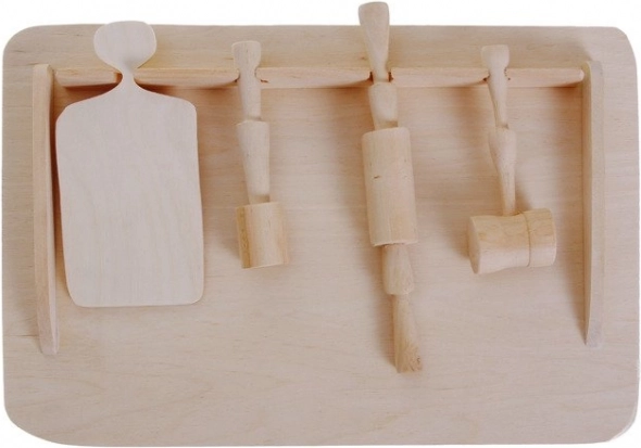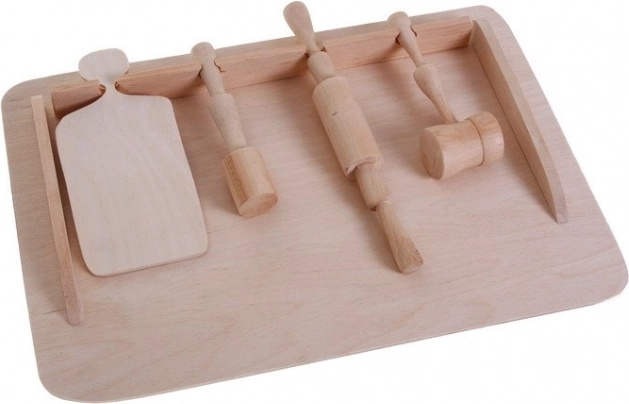 Hölzerne Teigunterlage mit Küchenutensilien für Kinder