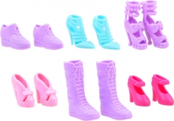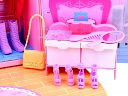 Puppe, tragbarer Kleiderschrank (Häuschen), mehrere Kleider und Outfits, mehrere Paar Schuhe, Handtaschen und Modeaccessoires, Kamm, Spiegel, Aufkleber