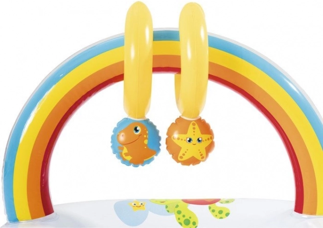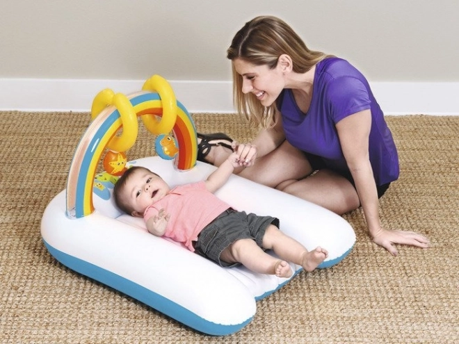 Über der Auflage befindet sich ein farbiger Spielbogen mit zwei Quietschspielzeugen, die die Aufmerksamkeit des Kindes auf sich ziehen und das Wickeln erleichtern. Nach dem Luftablassen lässt sie sich leicht zu einem kleinen Paket zusammenlegen – die perfekte Lösung für Reisen, Urlaub und Besuche.