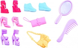 Puppe, mehrere Kleidungsstücke (Kleider, T-Shirts, Hosen), mehrere Paar Schuhe, Handtasche, Friseurzubehör (Föhn, Glätteisen, Schere, Zerstäuber), Kamm, Spiegel