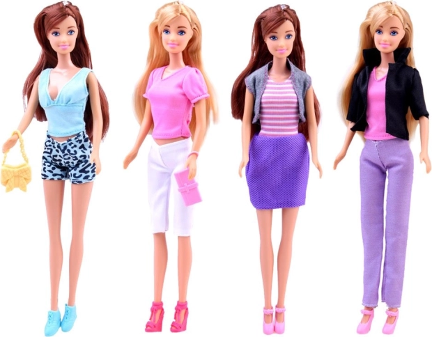 Im Set enthalten sind Textil-Outfits in verschiedenen Farben und Mustern, mehrere Paar Schuhe, eine Handtasche und ein Set aus Kunststoff-Friseurwerkzeugen. Kinder trainieren ihre Feinmotorik, Kreativität und entfalten ihre Fantasie beim Erfinden neuer Styles und Frisuren.