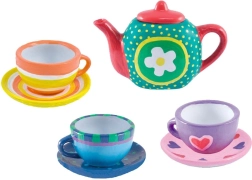 Gestalte dein eigenes keramisches Teeset! Dieses kreative Set für kleine Künstler enthält 3 Tassen, 3 Untertassen und ein Kännchen sowie alle Hilfsmittel – Farben, Pinsel, Palette und Aufkleber. Toller kreativer Spaß für Kinder ab 5 Jahren und die perfekte Ausstattung für Teestunden mit Puppen und Kuscheltieren.