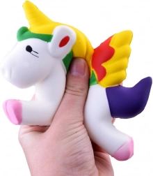 Der weiße Körper mit bunter Mähne, Schweif und Flügeln wirkt verspielt und motiviert zur wiederholten Nutzung.