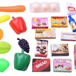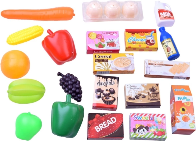 Das Set enthält verschiedene Arten von realistisch aussehenden Kunststofflebensmitteln, die Kinder erforschen und in ihrem imaginären Geschäft verwenden können.
