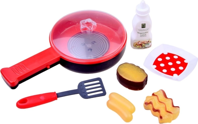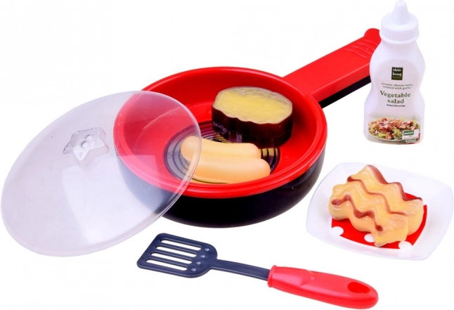 Das Set beinhaltet eine Pfanne, einen Deckel, verschiedene Arten von Lebensmitteln und Zubehör, das Kinder beim Spielen von Kochszenarien verwenden können.