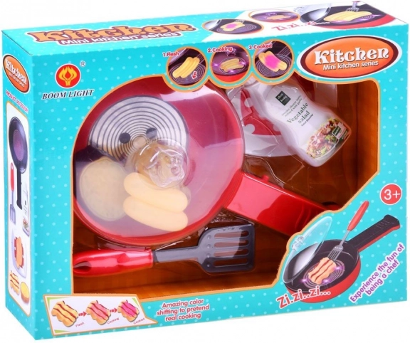 Dieses Küchen-Set bietet wunderbaren Spaß für jedes Kind, das kulinarische Erlebnisse liebt. Die Pfanne leuchtet auf Knopfdruck am Griff und erzeugt Geräusche von gebratenen Speisen, wodurch das Spiel realistischer wird. Zudem ändern die gebratenen Produkte unter dem Einfluss der Lichter in der Pfanne ihre Farbe.