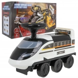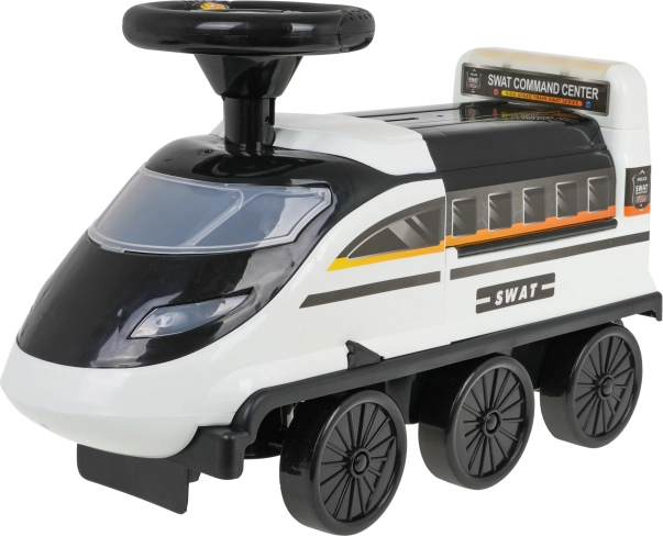 Das interaktive Rutschfahrzeug in Lokomotivform bietet unverwechselbare Spielerlebnisse. Hergestellt aus hochwertigem, strapazierfähigem und ungiftigem Kunststoff. Dieses Rutschfahrzeug fährt auf sechs Rädern, von denen zwei vorn schwenkbar sind. Unter dem Sitz verbirgt sich ein ausklappbarer Polizeipark mit Rampen, beweglichem Aufzug, öffnender Schranke, Hebebühne und Drehrad.