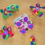 Universelle vierblättrige Teile verbinden sich zu flachen und räumlichen Modellen. Bauen Sie eine Brücke, ein Armband, einen Ball oder ein Windrad und verändern Sie die Formen im Handumdrehen.