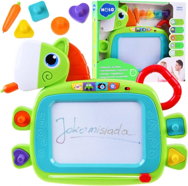 Die Tafel in Form eines Pferdes verfügt über Lichteffekte und Klänge, die jedes Kind ansprechen.