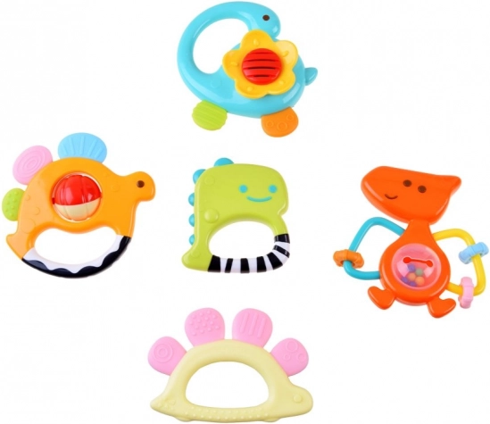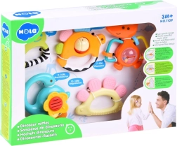 Entdecken Sie das Rassel- und Beißring-Set, das speziell für die Kleinsten konzipiert wurde, die gerade anfangen, die Welt zu entdecken. Dieses Set umfasst fünf Rasseln in Dinosaurierform, jede aus klarem Kunststoff und kinderfreundlich.