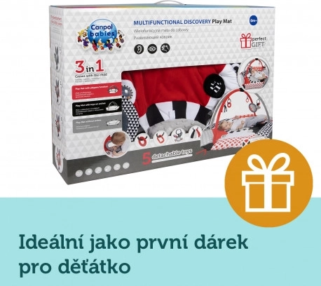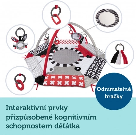 Die Spieldecke bietet 5 abnehmbare Spielzeuge zur Stimulation der Sinne und Förderung der Entwicklung: Rassel, Beißring, Spiegel, bunte Bänder und ein quietschendes/raschelndes Element.