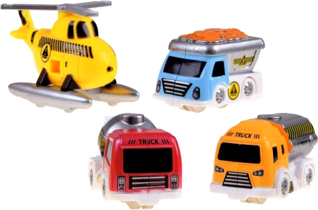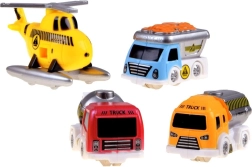 Enthalten sind drei Baufahrzeuge – Kipper, Betonmischer, Tankwagen – sowie ein Hubschrauber. Außerdem eine Bauarbeiterfigur für noch realistischeres Spiel.