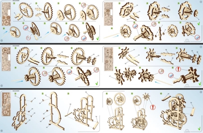 Präzise ausgeschnittene Teile greifen passgenau ineinander. Für minimalen Reibungswiderstand genügt es, die Achsen gemäß Anleitung mit normalem Kerzenwachs zu schmieren.