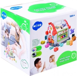 Enthalten sind 11 verschiedene 3D-Bausteine (Formen und Tiere) zum Einsetzen in die passenden Öffnungen sowie eine spezielle Gummiöffnung zum taktilen Formeraten. Das Spielzeug fördert auf natürliche Weise Neugier, selbstständiges Entdecken und die Sinneswahrnehmung.