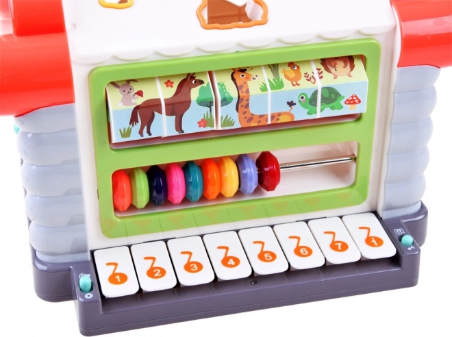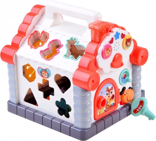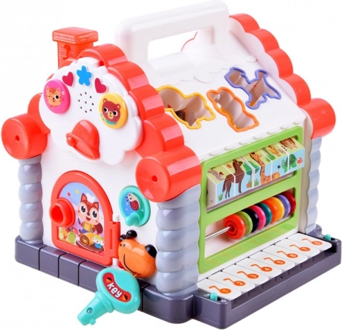 Dieses Entdecker-Häuschen besteht aus hochwertigem, robustem Kunststoff in attraktiven Farben. Es bietet zahlreiche interaktive Funktionen: Beim richtigen Einsetzen eines Teils ertönt das Geräusch des entsprechenden Tieres, die Miniklaviatur spielt die Tonleiter und 7 beliebte Melodien, und der Zählrahmen unterstützt das erste Zählen. Mit Schlüssel und Türchen trainieren Kinder Feinmotorik und Hand-Auge-Koordination.