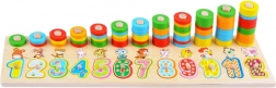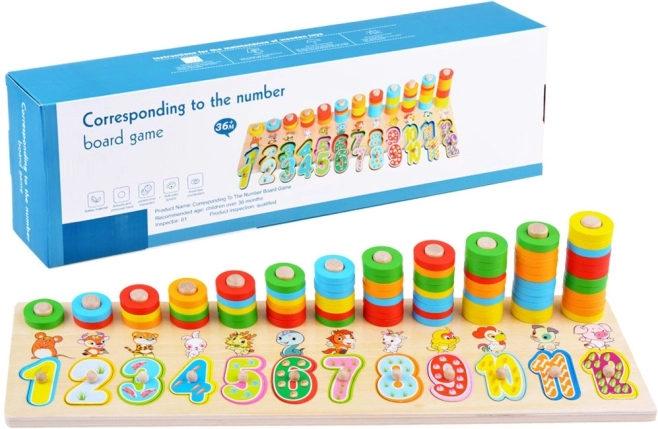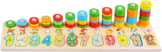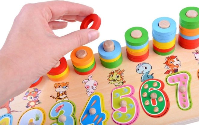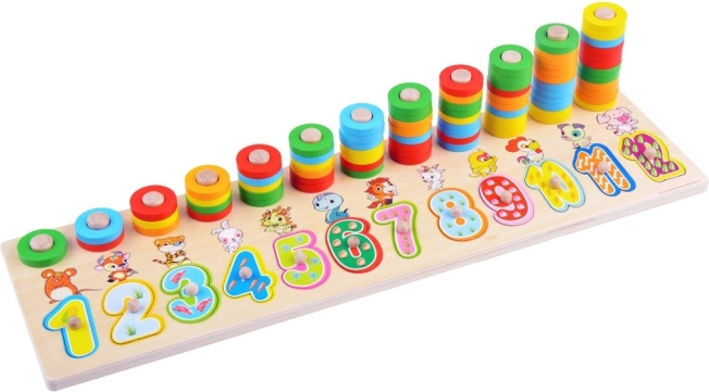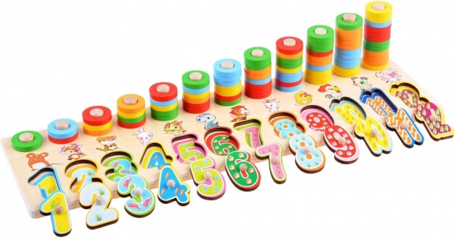 Dieses Lernspielzeug aus Holz kombiniert Formensortieren, Farbsortieren und erste Mathematik. Kinder setzen große Ziffern in die passenden Aussparungen und stecken bunte Ringe auf Stifte, wodurch sie den Zahlenwert und einfaches Zählen leicht begreifen. Die Tierillustrationen bei den einzelnen Zahlen unterstützen das Gedächtnis und den Wortschatz.