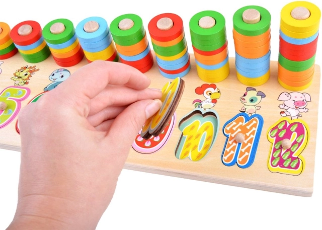 Das Aufstecken der Ringe auf die Stifte und das Einsetzen der Ziffern trainiert Feinmotorik, Hand-Auge-Koordination und Aufmerksamkeit.