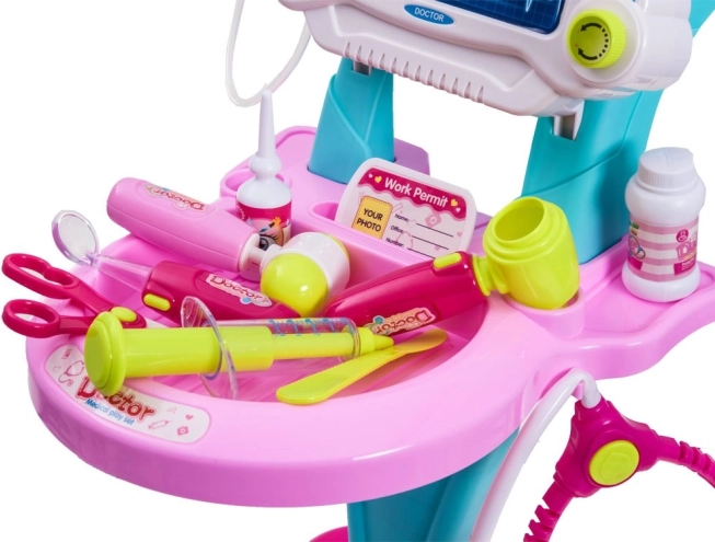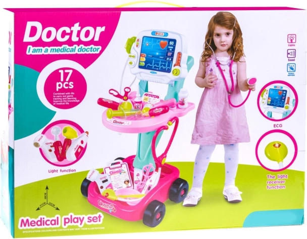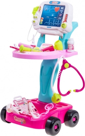 Das interaktive Panel mit Effekten (Licht und Ton) simuliert die Patientenüberwachung, während funktionale Elemente wie das „blinkende Herz“ am Stethoskop oder die beleuchteten Werte am Thermometer und Blutdruckmessgerät noch tiefer ins Spiel hineinziehen. Der Wagen mit Rollen ermöglicht das einfache Transportieren des gesamten Sets.