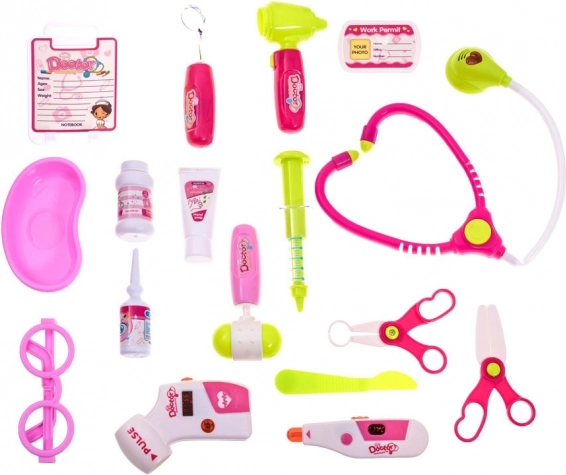 Stethoskop mit blinkendem Herz, Thermometer und Blutdruckmessgerät mit beleuchteten Werten, Otoskop, Spritze, Schere, Hammer und weiteres Zubehör.