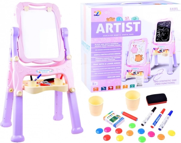 Diese farbenfrohe, zweiseitige Tafel bietet alles für kleine Künstler: Auf der schwarzen Seite kann mit Kreide geschrieben werden, die weiße Magnetseite eignet sich für trocken abwischbare Marker, Magnete oder zum Anheften von Papier zum Malen. Das praktische Ablagebrett und die Becher halten Kreiden, Marker und Pinsel stets griffbereit.