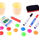 Utensilien wie Kreiden, Marker und Pinsel haben ihren Platz im Ablagebrett und in den Bechern – so ist alles stets griffbereit.