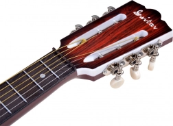 Die Kopfplatte mit Mechaniken ermöglicht das Anpassen der Saitenspannung und das Grundstimmen für Einsteiger.