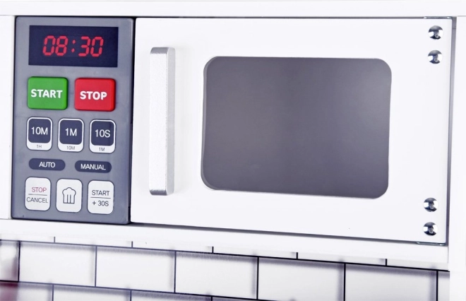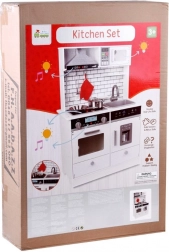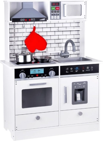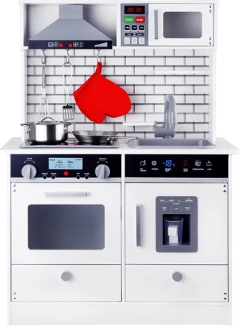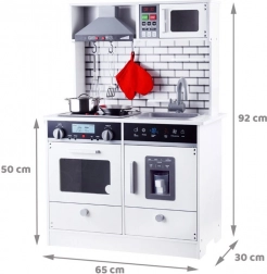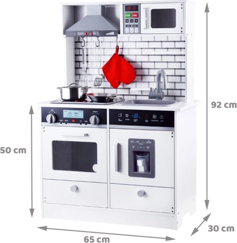 Diese schöne Holzküche ist mit allen notwendigen Geräten ausgestattet, die es den Kindern ermöglichen, die leckersten Gerichte zu kochen. Die Gestaltung in Weiß mit modernen Fliesen passt perfekt in jedes Kinderzimmer oder Küchenbereich.