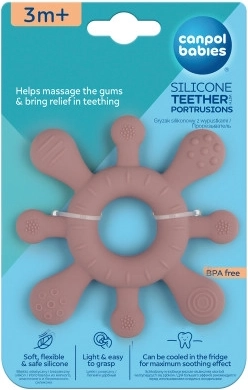 Der Silikon-Beißring von Canpol babies mit Noppen wurde im Hinblick auf den Komfort und die Entwicklung des Kindes entworfen. Die abwechslungsreiche Struktur massiert sanft das Zahnfleisch und lindert Schmerzen beim Zahnen. Die Form des Beißrings ist ideal für kleine Kinderhände und erleichtert das Greifen. Der Beißring besteht aus weichem, flexiblem und sicherem Silikon, das sanft zum empfindlichen Zahnfleisch des Babys ist. Der Silikon-Beißring Canpol babies STERN mit Noppen ist frei von schädlichem BPA (Bisphenol A) und somit völlig unbedenklich für die Gesundheit des Kindes. Der Silikon-Beißring von Canpol babies mit unterschiedlichen Strukturen an den Rändern des Sterns unterstützt die motorische Entwicklung des Kindes. Bringt Linderung beim Zahnen! Leicht und praktisch – ideal für kleine Kinderhände. Weiches und sicheres Silikon – sanft zum empfindlichen Zahnfleisch des Kindes. Fördert die Entwicklung der Feinmotorik und die Hand-Auge-Koordination. Das Produkt ist für Kinder ab 3 Monaten geeignet. Das Spielzeug besteht aus sicherem Material ohne Bisphenol A. Gebrauchsanweisung: Halten Sie das Spielzeug sauber. Mit einer weichen Bürste unter fließendem Wasser und mildem Reinigungsmittel waschen, gründlich abspülen. Wichtig! Für die Sicherheit und Gesundheit Ihres Kindes! Vor dem ersten Gebrauch mit kochendem Wasser übergießen. Nicht auskochen, nicht sterilisieren. Den Beißring nicht direkter Sonneneinstrahlung aussetzen, er könnte ausbleichen oder reißen. Vor jedem Gebrauch sorgfältig prüfen. Ersetzen, wenn das Produkt abgenutzt, beschädigt oder angebissen ist. Bewahren Sie die Anleitung für eine spätere Verwendung auf. Nicht geeignet für die Reinigung in der Spülmaschine, zum Auskochen und zur Sterilisation im Sterilisator. Der elastische Beißring entspricht den Anforderungen: Richtlinie 2009/48/EG des Europäischen Parlaments und des Rates über die Sicherheit von Spielzeug, EN 71-1 Sicherheit von Spielzeug – Teil 1: Mechanische und physikalische Eigenschaften, EN 71-2 Sicherheit von Spielzeug – Teil 2: Entflammbarkeit, EN 71-3 Sicherheit von Spielzeug – Teil 3: Migration bestimmter Elemente.